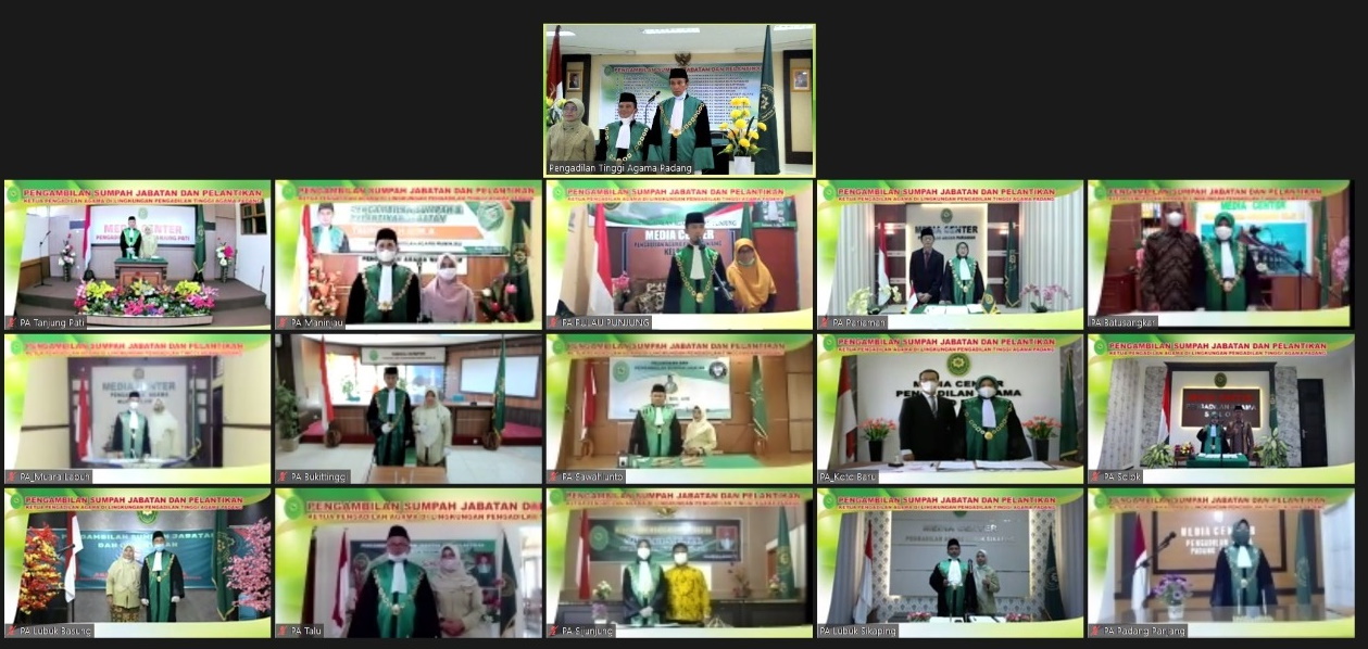 Kamis (15/07/2021) Ditengah Pemberlakuan Pembatasan Kegiatan Masyarakat (PPKM) Darurat COVID-19 di Kota Padang, Pengadilan Tinggi Agama Padang gelar pengambilan sumpah jabatan dan pelantikan 16 Ketua Pengadilan Agama secara blended, Ketua Pengadilan Agama Padang dilantik secara luring 15 Ketua Pengadilan Agama lainnya secara daring.
